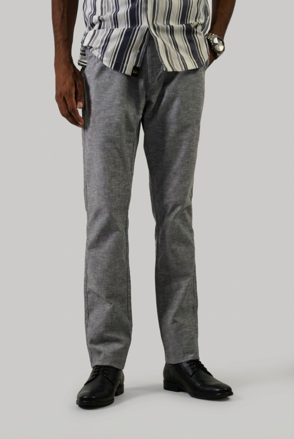 These trousers are made from high-quality linen fabric that is very breathable and perfect for warm weather. The light grey color has a nice textured look that makes the pants feel more expensive and stylish. They have a clean, smooth front that gives you a neat and professional shape.