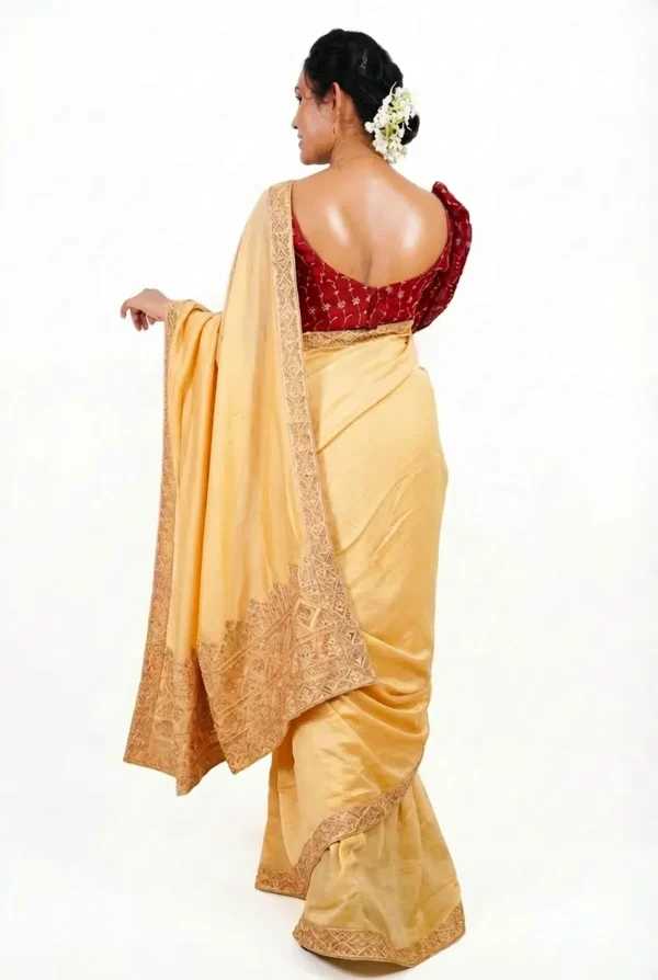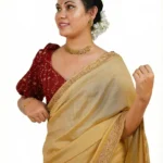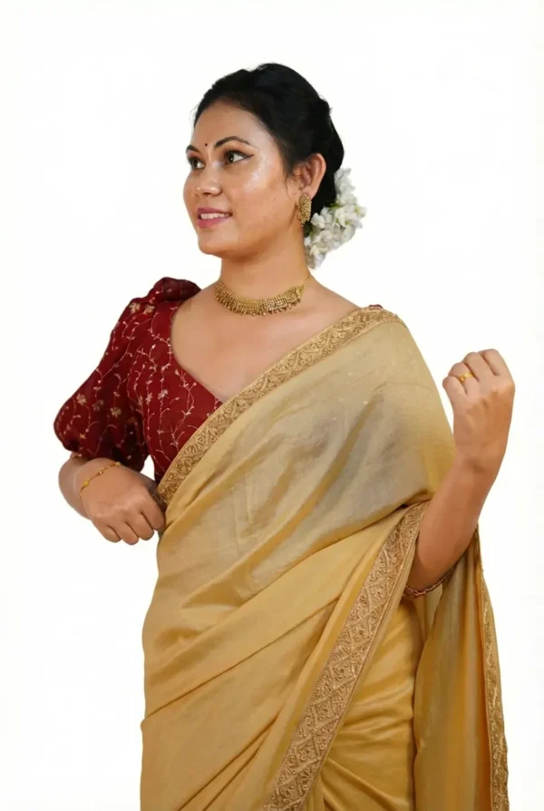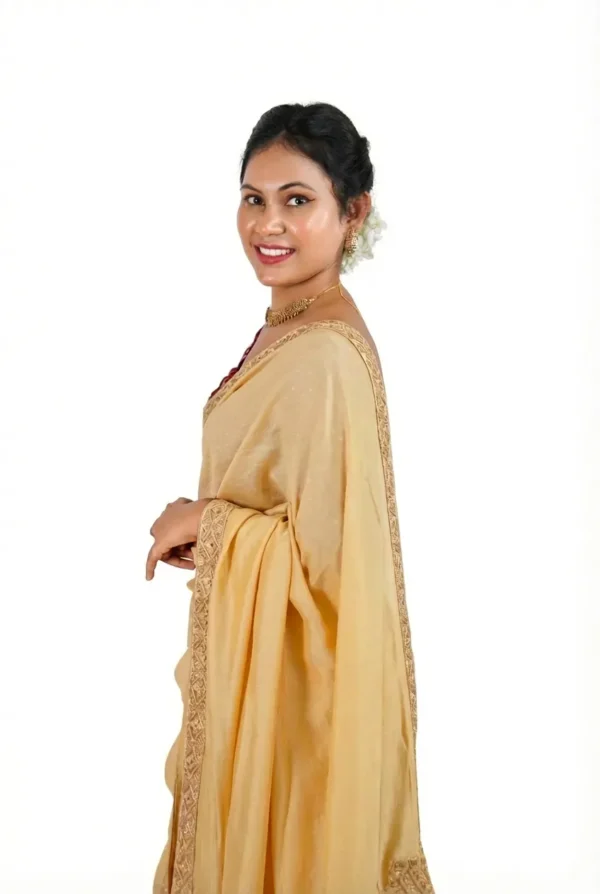 This saree comes in a graceful golden shade that looks rich, soft, and timeless. The fabric drapes smoothly, giving a neat and elegant fall that suits all body types. The detailed woven border adds a traditional touch without making the saree look heavy.
